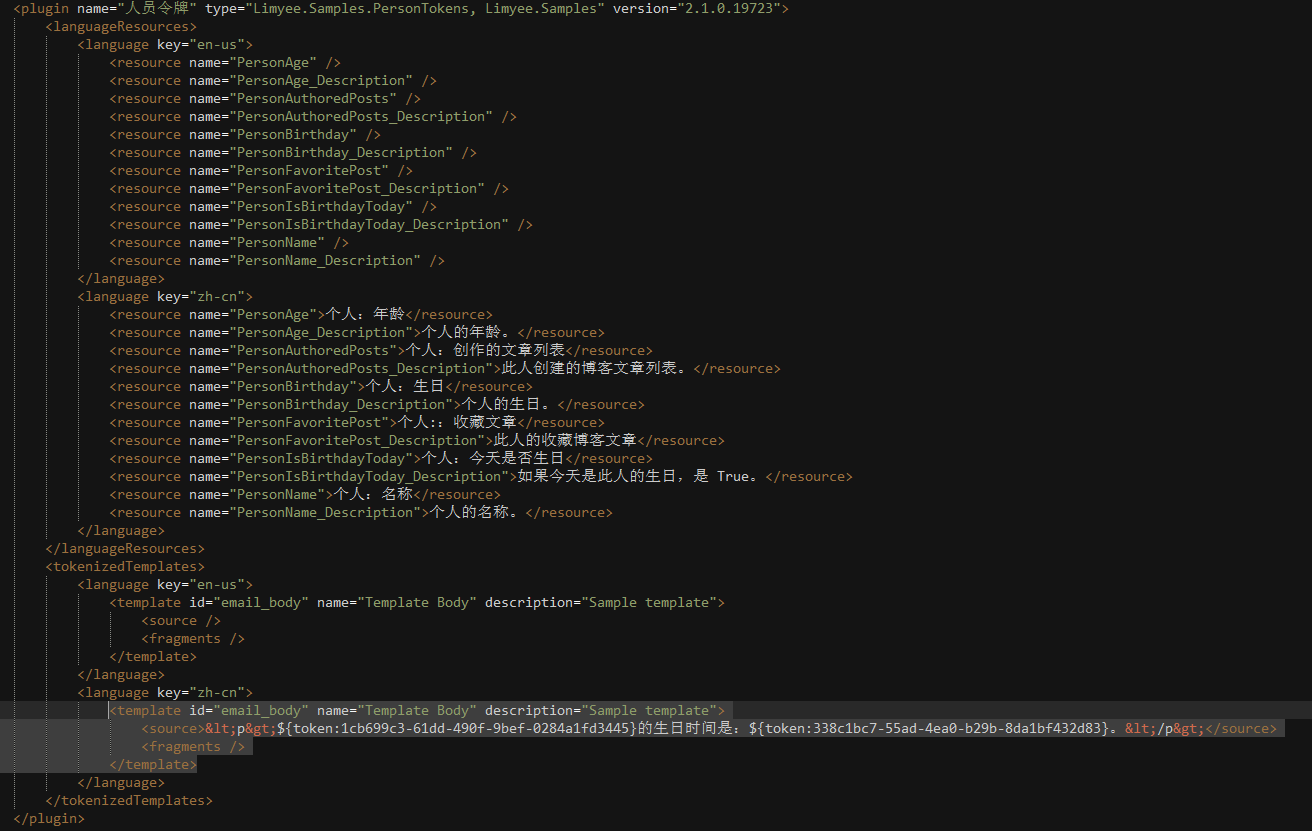 public TokenizedTemplate[] DefaultTemplates { get { if (_defaultTemplates == null) { var myTemplate = new TokenizedTemplate(EmailTemplateConstants.Body) { Name = "Template Body", Description = "Sample template", ContextualDataTypeIds = new[] { _dataTypeId } }; myTemplate.Set("en-us", @" <template id=""email_body"" name=""Template Body"" description=""Sample template""> <source><p>${token:1cb699c3-61dd-490f-9bef-0284a1fd3445}的生日时间是:${token:338c1bc7-55ad-4ea0-b29b-8da1bf432d83}。</p></source> <fragments /> </template>"); _defaultTemplates = new[] { myTemplate }; } return _defaultTemplates; } }
