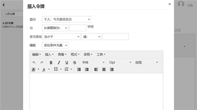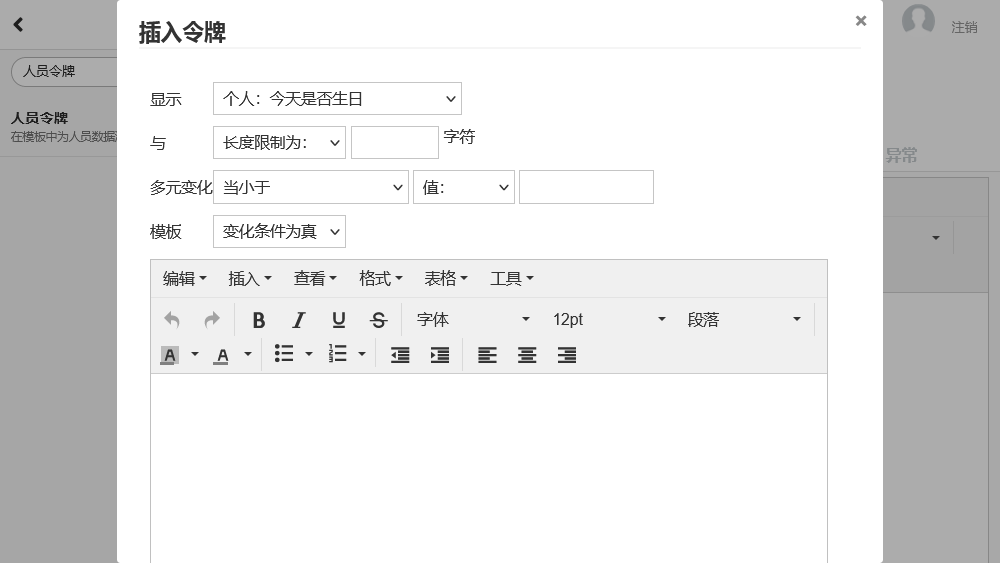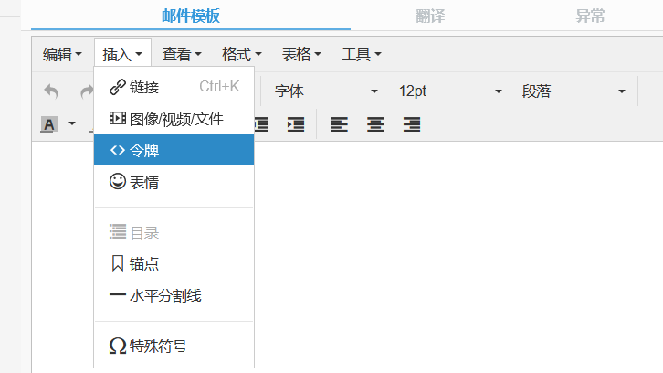 从这里,您可以使用整个 Limyee 电商平台中使用的内容编辑器创建模板。对于启用了模板的编辑器,可以在 插入 > 插入令牌下使用其他选项。