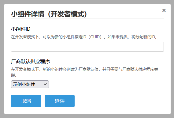 启用开发者模式后,在管理 > 界面 > 小组件工作室,通过点击+图标来创建新的小组件。在“小组件详细信息(开发者模式)”模态中,选择出厂默认提供程序的名称,例如:“示例小组件”: