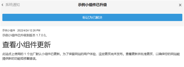 - 发送升级消息。 如果插件是升级(而不是初始安装),则使用 ISystemNotifications.Create() API 发送升级系统通知,以通知系统管理员插件已成功升级,如果有任何小组件更改,将提供审阅消息。