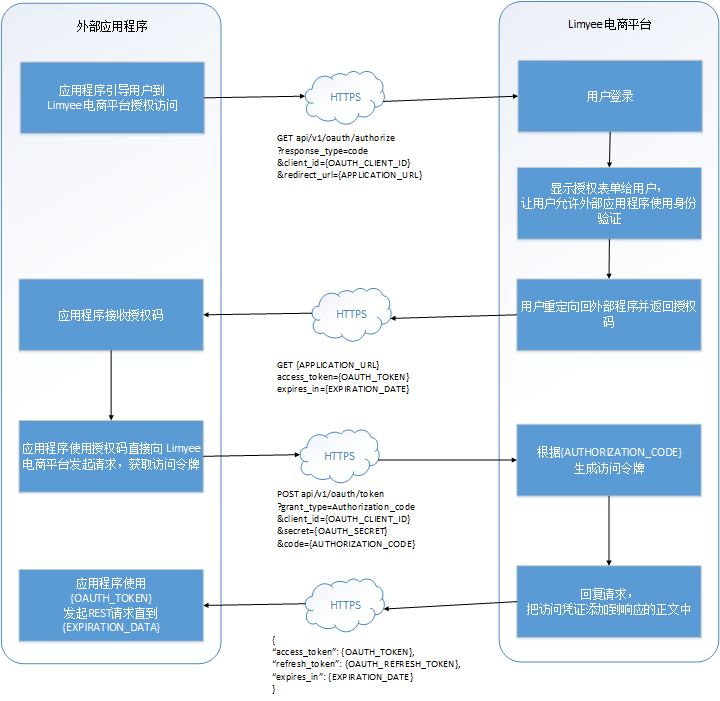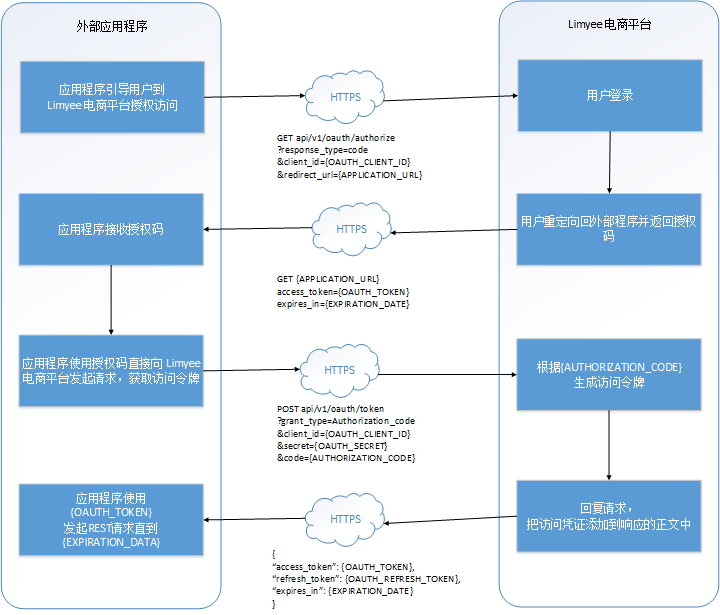 使用授权代码授予类型时,客户端应用程序首先通过向 Limyee 电商平台站点发出请求来请求授权代码:api/v1/oauth/token,其中包含以下参数: