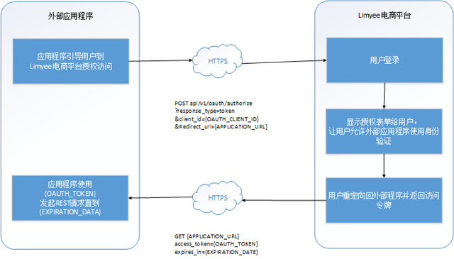 可与"机密"或"公共"客户端类型一起使用。为了实现隐式授权类型,客户端应用程序对用户进行身份验证,并将用户发送到 Limyee 电商平台 站点。 然后,用户确认他们希望允许客户端应用程序代表他们执行操作。然后,用户被重定向到客户端定义的重定向 URL,并带有access_token,并将expires_in追加到查询字符串。 此授权类型最适合已经利用与 Limyee 电商平台的单点登录集成的外部应用程序 . |